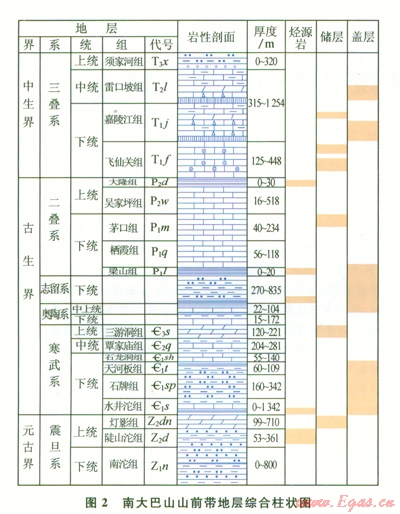 該區(qū)主要經(jīng)歷了2個(gè)大的沉積—構(gòu)造演化階段:震旦紀(jì)—中三疊世為海相臺(tái)地—臺(tái)緣沉積—構(gòu)造演化階段;晚三疊世—始新世為陸相碎屑沉積盆地沉積—構(gòu)造演化階段??傮w上缺失上志留統(tǒng)一石炭系,其他層位較為齊全。發(fā)育4套構(gòu)造—地層沉積組合:①基底組合(Pt);②臺(tái)地(臺(tái)緣)組合(Z—S);③臺(tái)地—裂陷邊緣組合(P—T2);④前陸盆地組合(T3x—J)。