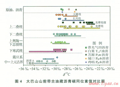 高演化烴源巖的生物標(biāo)志化合物在油源對(duì)比工作中存在很多不確定性,而不同時(shí)代烴源巖干酪根和抽提物同位素組成之間有明顯的差異,是油源和氣源對(duì)比的一種現(xiàn)實(shí)方法。南方海相古生界烴源巖中干酪根碳同位素值變化非常有規(guī)律,從中上元古界到上古生界,干酪根的碳同位素值由輕變重。該區(qū)古油藏瀝青和油苗的碳同位素值分布,均與上二疊統(tǒng)泥巖氯仿瀝青“A”的碳同位素值接近(圖4),表明它們之間具有親緣性。