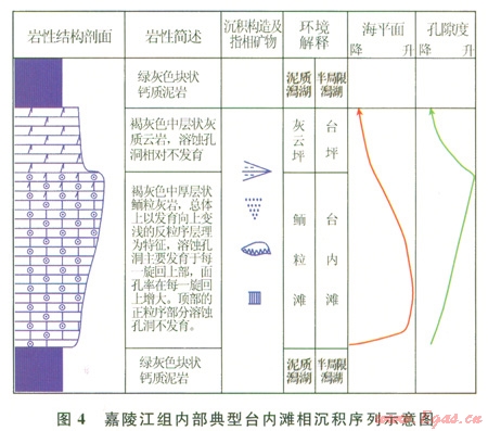 區(qū)域地質(zhì)研究表明,川南地區(qū)嘉二時(shí)期發(fā)生了次大規(guī)模的海退,嘉二1亞段沉積時(shí)水體變淺,波浪作用相對(duì)較強(qiáng),由于臺(tái)地內(nèi)部古地形的起伏不平,發(fā)育于局部水下高地或隆起的臺(tái)內(nèi)灘相為本區(qū)高能環(huán)境下的產(chǎn)物。其顆粒組分含量高,巖石類型主要有中薄層—中厚層粉晶殘余砂屑有孔蟲(chóng)白云巖、中厚層生屑砂屑灰云巖、厚層礫砂屑灰云巖或云巖、厚層殘余鮞粒灰?guī)r和粉晶殘余砂屑灰?guī)r。剖面結(jié)構(gòu)上,以向上變淺序列發(fā)育為主要特征,旋回底部為開(kāi)闊潮下、局限瀉湖、半局限瀉湖或?yàn)╅g海沉積,巖性為暗色泥巖、白云巖或石灰?guī)r以及它們的過(guò)渡巖類;由于等效海退的影響,剖面中部巖性為較高能的鮞?;?guī)r或云巖、砂屑灰?guī)r或云巖等,粒徑向上變粗;旋回上部,由于灘體的生長(zhǎng)速度大于海平面相對(duì)上升速度,沉積界面很快位于平均海平面附近,巖性以云質(zhì)灰?guī)r、白云巖和膏鹽巖為特征(4)
