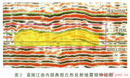 地震剖面上表現(xiàn)為丘形反射,內(nèi)部常見(jiàn)弱的前積反射,內(nèi)部反射時(shí)差較兩側(cè)明顯增大,該類地震相通常代表一種相對(duì)高能的沉積環(huán)境。主要發(fā)育在嘉一段—嘉二l亞段內(nèi),其頂界即嘉二2亞段底界多表現(xiàn)為連續(xù)的強(qiáng)振幅反射(2)