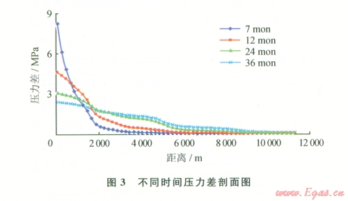 根據數值模擬軟件運算結果,繪制典型剖面壓力分布圖,當注入7個月后井底壓力達到28 MPa,壓力逐漸向外為擴散,若假設不注條件下,由于南區(qū)和長北合作區(qū)壓力差的存在,壓力波也會隨時間的延長向外擴散。用以上兩個壓力剖面相減,即可得到壓力剖面上注采過程中不同距離與壓力差之間的關系(圖3)。設置可以觀察的基準壓力值,即可得到不同注采周期下,壓力波的傳播距離在1、2、3年的注氣周期下壓力波傳播距離分別為4. km、6.1 km和7.6 km。