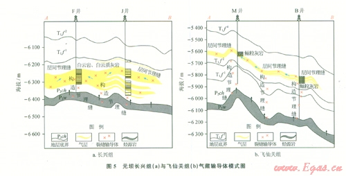 摘 要 四川盆地川東北元壩氣田的氣藏類型為我國埋藏最深、以臺(tái)地邊緣礁灘相儲(chǔ)層為主的大型礁灘巖性氣藏,勘探形勢(shì)整體較好,然而其海相主要產(chǎn)氣層上二疊統(tǒng)長興組與下三疊統(tǒng)飛仙關(guān)組的氣藏規(guī)模差異較大。為找出二者產(chǎn)能差異性的成因,對(duì)其儲(chǔ)層、輸導(dǎo)體系、壓力系統(tǒng)及儲(chǔ)源關(guān)系等特征進(jìn)行了地質(zhì)與成像測(cè)井相結(jié)合的綜合分析。結(jié)論認(rèn)為:該區(qū)下三疊統(tǒng)嘉陵江組上部一中三疊統(tǒng)雷口坡組膏鹽巖蓋層分布穩(wěn)定,長興組與飛仙關(guān)組氣藏氣源均主要來自上三疊統(tǒng)吳家坪組(P2w)和龍?zhí)督M(P