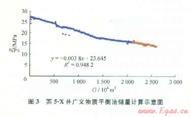 圖3為蘇5-X氣井采用廣義物質(zhì)平衡法儲(chǔ)量計(jì)算示意圖。該井于2007年10月13號(hào)投產(chǎn),截至2010年底累計(jì)采氣量達(dá)到了2574.21×104m3,2009年12月氣體流動(dòng)達(dá)到擬穩(wěn)定狀態(tài),通過線性直線關(guān)系得到:G=14286.36×104m3