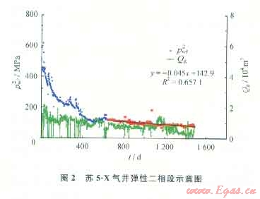 針對(duì)致密低滲儲(chǔ)層的滲流特征,假定儲(chǔ)層遠(yuǎn)端存在著一個(gè)移動(dòng)的、基本不滲透的(實(shí)際上是低滲)模糊邊界,當(dāng)氣井穩(wěn)定生產(chǎn)一段時(shí)間后,壓力波及會(huì)觸及到此邊界,此時(shí)產(chǎn)量、壓力會(huì)出現(xiàn)“擬穩(wěn)態(tài)”(圖2),在求取Pwf2-t關(guān)系曲線(近似直線)斜率后,可利用彈性二相法估算壓力波及范圍內(nèi)的可動(dòng)儲(chǔ)量。該儲(chǔ)量?jī)H能代表壓力波及范圍內(nèi)的可動(dòng)儲(chǔ)量,隨著日后生產(chǎn)繼續(xù),累積產(chǎn)氣量增加,需要重復(fù)計(jì)算予以進(jìn)一步核實(shí)和校正。實(shí)踐證明,在不關(guān)井情況下,彈性二相法儲(chǔ)量具有重要的參考價(jià)值。蘇5區(qū)塊達(dá)到計(jì)算條件的氣井有41口,
