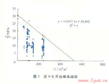 圖1為蘇5-X氣井的壓降儲(chǔ)量計(jì)算示意圖。該井于2006年10月12號(hào)投產(chǎn),截至2010年底已累計(jì)采出天然氣243.12×104m3,根據(jù)曲線可計(jì)算得到:G=530.26×104m3。