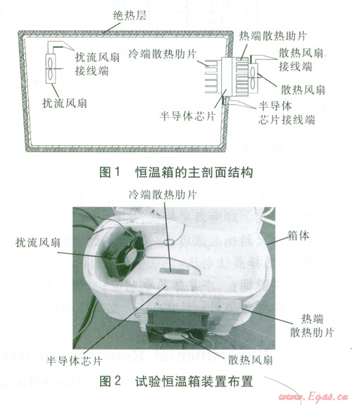 小型半導(dǎo)體恒溫箱(以下簡(jiǎn)稱恒溫箱)主要由箱體、半導(dǎo)體芯片、冷熱端散熱肋片組成,主剖面結(jié)構(gòu)見圖1,試驗(yàn)恒溫箱裝置布置見圖2。恒溫箱的內(nèi)部空間尺寸為長(zhǎng)<?xml:namespace prefix = "st1" />