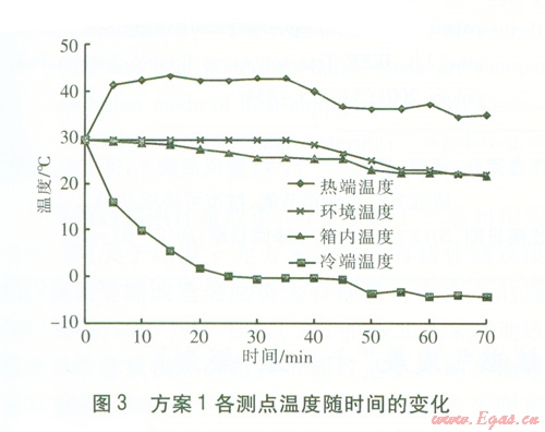 方案l:保持工作電壓為l2 V,散熱風(fēng)扇運(yùn)行,在正常環(huán)境溫度下,測(cè)量各測(cè)點(diǎn)溫度,直至冷端溫度、箱內(nèi)溫度穩(wěn)定為止。然后降低環(huán)境溫度,并記錄各測(cè)點(diǎn)溫度。