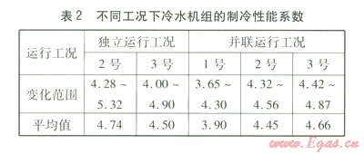 由表2可知,單臺機組運行時,機組的制冷性能系數(shù)較高,均大于40。當兩臺機組并聯(lián)運行時,l號機組的制冷性能系數(shù)較低。分析冷水機組性能曲線發(fā)現(xiàn),當大小兩臺冷水機組負荷分配比例接近32時,兩臺機組的總運行功率較小,處于節(jié)能狀態(tài)。在制冷工況下,冷水系統(tǒng)輸送能效比的平均值為0026 3,比GB 50189--2005《公共建筑節(jié)能設計標準》規(guī)定的限值0024 1偏大一些,冷水系統(tǒng)處于不節(jié)能的運行狀態(tài)。