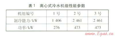 供冷期為51930??照{(diào)系統(tǒng)包括:3臺離心式冷水機組,性能參數(shù)見表1;4臺冷水循環(huán)泵,揚程為321 m,流量為400 m3h,功率為397 kW。周一至周五冷水機組在600開啟,在2000停止。冷水循環(huán)泵在大部分時間單臺運行,并且在整個夏季保持至少l臺一直開啟。