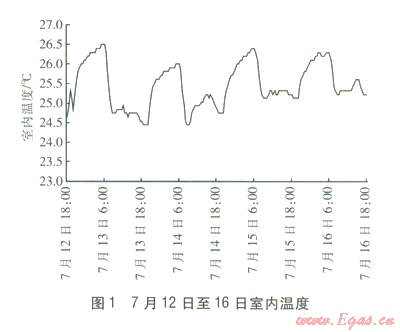 712 日至16日室內(nèi)溫度變化見圖1。由圖1可知,空調(diào)系統(tǒng)停止運行后,室內(nèi)溫度在000之前升溫較快,000之后升溫緩慢,最高達到265℃,溫度上升并不明顯。因此,冷水機組在人員下班后即可停止運行,即停機時間調(diào)整為1800,而冷水循環(huán)泵則運行至2000停機,以利用冷水剩余冷量,可降低運行費用。