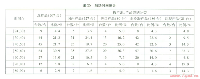 由表25,我們可以得出以下結(jié)論:全部樣品加熱時間分布范圍為2490 s,其中在3060 s范圍分布比例較大,冷凝產(chǎn)品、非冷凝產(chǎn)品、國內(nèi)產(chǎn)品與進口產(chǎn)品分布趨勢與總樣品趨勢相同。