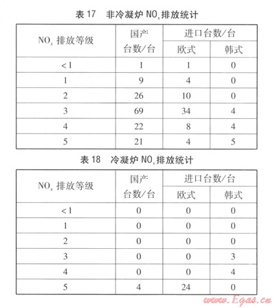 16中,l級最差,5級最好。非冷凝爐N0x排放統(tǒng)計見表l7,冷凝爐N0x排放統(tǒng)計見表1 8。
