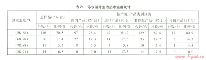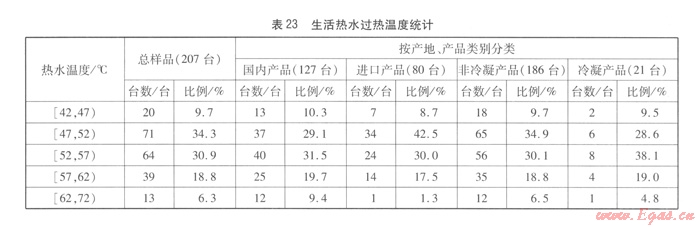 由表23,我們可以得出以下結(jié)論:全部樣品生活熱水過熱溫度分布范圍為4272℃,其中在4762℃范圍分布比例較大。冷凝產(chǎn)品在4757 ℃范圍分布比例較大,非冷凝產(chǎn)品、國內(nèi)產(chǎn)品與進口產(chǎn)品分布趨勢與總樣品趨勢基本相同。