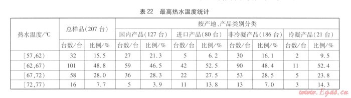 由表22,我們可以得出以下結(jié)論:全部樣品最高熱水溫度分布范圍為5777℃,其中在6272℃范圍分布比例較大。冷凝產(chǎn)品和非冷凝產(chǎn)品在6272℃范圍分布比例較大,國內(nèi)產(chǎn)品在5772℃范圍分布比例較大,進口產(chǎn)品在6277℃范圍分布比例較大。