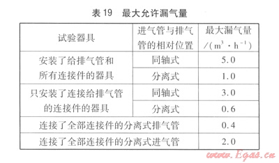 GB 25034-2010標準的第622條規(guī)定了燃燒系統(tǒng)密封性,在規(guī)定的試驗條件下,器具給、排氣系統(tǒng)泄漏量應(yīng)小于表19的規(guī)定值。