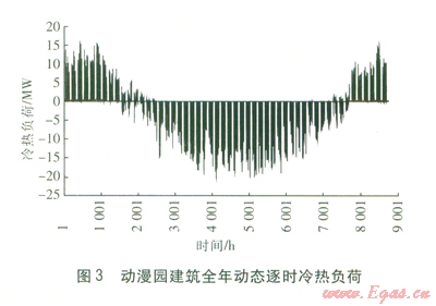采用Energyplus模擬計算動漫園建筑全年動態(tài)逐時冷熱電負荷。全年動態(tài)逐時冷熱負荷見圖3,圖中正值為熱負荷,負值為冷負荷。由圖3可知,全年最大冷負荷為20 532.8 kW,最大熱負荷為15 987.3kW。建筑全年各時段用電負荷(不含空調系統用電負荷)比較均衡,全年最大用電負荷為6 883.5 kW。