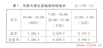 燃氣價格按照2.4 元/m3計算,中新天津生態(tài)城各時段電價見表l。此外,燃氣輪機部分負荷率下降到0.5以下時熱效率下降嚴重,因此將燃氣輪機部分負荷率≥0.5作為約束條件。將以上參數輸入到優(yōu)化評價模型就可得到聯供系統的最優(yōu)設備配置和運行策略。