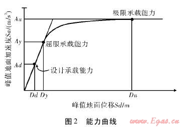 能力——需求譜分析方法的理論基礎為目前在抗震設計中廣泛采用的靜力彈塑性分析方法,即Push-over分析方法。建構筑物在地震中的反應由能力曲線代表,該曲線反映了結構受到地震橫向載荷與頂點位移關系曲線(能力譜)。再將地震波到達建構筑物場地的反應譜轉化為需求譜,兩曲線的交點即性能點,作為建筑物在地震作用下的峰值位移或加速度。