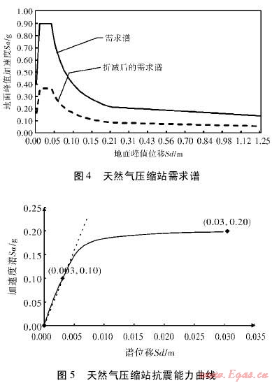 為了進一步得到該站抗震能力曲線。以圖2所示能力曲線為基本形狀,并依據(jù)HAZUS-MH對相關能力曲線參數(shù)進行設置。本例中屈服承載能力與極限承載能力兩個控制點相關參數(shù)設置如下:Cs0.05,Te0.35,α為0.75,γ為1.5,λ為2,μ為5。將以上參數(shù)代入能力譜控制點公式,得到該天然氣壓縮站抗震能力曲線如圖5所示。