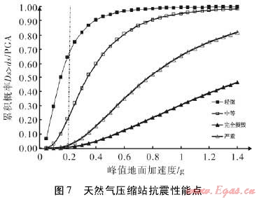 7所示脆弱性曲線,反映了該天然氣壓縮站四種破壞程度的概率值。由圖中任一條脆弱性曲線趨勢可以看出,隨著地震所導致的地面峰值加速度的加大,特定破壞程度的概率也在不斷的提高。并且當?shù)孛娣逯导铀俣戎迪嗤瑫r,壓縮站較低破壞程度的概率相對較高。最后,根據(jù)圖6中確定的性能點,可以得到當峰值地面加速度為0.2g時,對應的輕微破壞的概率約為0.65,而對應中等破壞的概率為0.2。至此,完成了在特定地震強度下該天然氣壓縮的脆弱性評估工作。