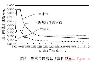 將天然氣壓縮站抗震能力曲線與需求譜繪制在同一坐標內(nèi),得到性能點,如圖6所示??梢钥闯?,性能點對應的地面峰值加速度約為0.2g,地面峰值加速度約為0.07m。該性能點反映了天然氣壓縮站在本次地震中所能承受的極限值。