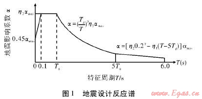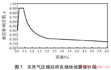 根據(jù)規(guī)范要求,采用如圖1形式的設計反應譜。反應譜相關參數(shù)設置如下:水平地震影響系數(shù)最大值為0.9,特征周期值為0.4s,建筑結構的阻尼比取0.05,地震影響系數(shù)曲線的阻尼調(diào)整系數(shù)為1.0,曲線下降段自特征周期至5倍特征周期區(qū)段的衰減指數(shù)取0.9。直線下降段自5倍特征周期至6s區(qū)段下降斜率調(diào)整系數(shù)取0.02。通過計算,得到天然氣壓縮站所在場地地震設計譜如圖3所示。以該反應譜作為該天然氣壓縮站所在場地的地震潛在危險。