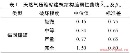 由于我國缺少燃氣壓縮站脆弱性曲線相關數(shù)據(jù),這里依據(jù)HAZUS中建議采用相關參數(shù),如表1所示,擬合出的天然氣壓縮站的脆弱性曲線,如圖7所示。