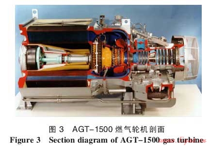 AGT-1500燃氣輪機的剖面見圖3。該燃氣輪機為三軸結(jié)構(gòu):低壓轉(zhuǎn)子、高壓轉(zhuǎn)子和動力渦輪轉(zhuǎn)子。5級軸流式低壓壓氣機帶可調(diào)進口導(dǎo)流葉片;高壓壓氣機由4級軸流式壓氣機和單級離心式壓氣機組成;每個壓氣機轉(zhuǎn)子由單級渦輪帶動,高壓渦輪導(dǎo)向葉片與工作葉片均為空心氣冷。2級動力渦輪帶可變幾何進口導(dǎo)流葉片,高壓壓氣機排出的空氣經(jīng)回?zé)崞鞅粍恿u輪排出的燃氣加熱后再進入單管式燃燒室。燃氣輪機由全功能數(shù)字電子調(diào)節(jié)器自動控制。