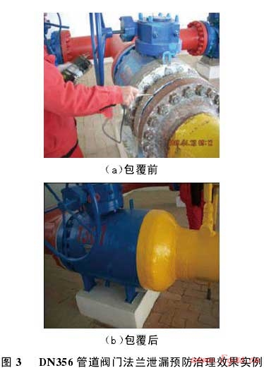 泄漏,然后按照上述施工流程對法蘭進(jìn)行碳纖維復(fù)合材料堵漏加固處理,待復(fù)合材料養(yǎng)護(hù)固化后,進(jìn)行耐壓密封試驗(yàn)。結(jié)果表明:采用碳纖維復(fù)合材料進(jìn)行管道法蘭滲漏治理,管道系統(tǒng)連接法蘭在 10 MPa 介質(zhì)壓力下,露天環(huán)境下穩(wěn)壓 14 d,堵漏區(qū)域無任何泄漏。可見,該套技術(shù)方案對存在泄漏隱患的管道法蘭泄漏治理非常有效。由于該套技術(shù)方案具有作業(yè)不動火、操作安全、成本費(fèi)用低等特點(diǎn),2008-2011年,采用復(fù)合材料修復(fù)技術(shù)對西氣東輸全線 220 多個線路閥室旁通管道 DN356 閥門連接法蘭及各站場與干線連接的DN50 和 DN80 管道法蘭泄漏隱患進(jìn)行治理(圖 3),在確保管道安全平穩(wěn)運(yùn)行的同時,節(jié)約了大量維修費(fèi)用。復(fù)合材料修復(fù)對法蘭結(jié)構(gòu)具有一定的加固作用,可提高法蘭的抗軸向拉伸、彎曲能力,防止密封面泄漏情況進(jìn)一步惡化。但是,對于已經(jīng)出現(xiàn)明顯泄漏的高壓(7 MPa 以上)法蘭,治理效果不佳。