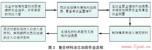 基本原理:對連接法蘭面間隙填充高強(qiáng)度堵漏密封材料,再用由高強(qiáng)度纖維與環(huán)氧粘結(jié)劑組成的復(fù)合材料對法蘭連接部位進(jìn)行整體外包覆,待復(fù)合材料結(jié)構(gòu)固化后,形成一個高強(qiáng)度殼體結(jié)構(gòu),實(shí)現(xiàn)整體加固,達(dá)到預(yù)防法蘭泄漏的目的(圖 2)。