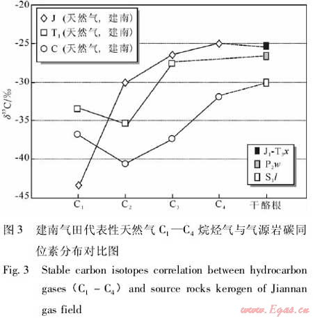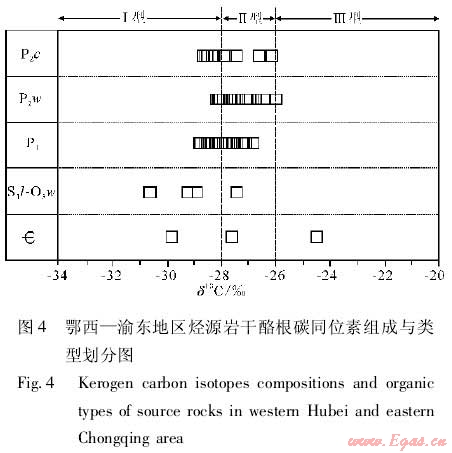 (3)本區(qū)長興組和飛仙關(guān)組天然氣的氣源巖主要為二疊系吳家坪組(P2w)烴源巖,且以Ⅱ型有機(jī)質(zhì)為主,能夠生成大量的原油,具備原油裂解作用發(fā)生的物質(zhì)基礎(chǔ)。對于本區(qū)高成熟度的天然氣而言,利用同位素資料進(jìn)行氣—巖對比是比較可靠的方法。本區(qū)侏羅系和石炭系天然氣的丁烷碳同位素分別為-25.0‰和-31.9‰,而三疊系天然氣丁烷的含量低,只測得丙烷碳同位素為-27.6‰,下志留統(tǒng)龍馬溪組(S1l)、吳家坪組(P2w)和侏羅系源巖干酪根的碳同位素均值分別為-30.0‰、-27.0‰和-25.5‰(圖3)。有研究表明,具有氣源關(guān)系的烴源巖的干酪根碳同位素比天然氣丁烷的碳同位素要重1.0‰左右[15]。根據(jù)這種對應(yīng)關(guān)系,侏羅系、三疊系飛仙關(guān)組和石炭系的天然氣應(yīng)該分別來源于侏羅系、二疊系吳家坪組和志留系龍馬溪組烴源巖(圖3)。從生儲配置關(guān)系來看,飛三段與上覆侏羅系之間有較厚的隔層,其氣源也不可能來自于侏羅系烴源巖;并且飛三段天然氣的碳同位素組成明顯重于石炭系天然氣(圖3),其不可能與石炭系天然氣具有相同的氣源巖。對于本區(qū)高過成熟的二疊系烴源巖(Ro均值為2.2%)而言,其有機(jī)質(zhì)類型用常規(guī)熱解和元素組成數(shù)據(jù)很難判斷[16],比較可靠的方法是利用源巖干酪根碳同位素?cái)?shù)據(jù)進(jìn)行分析。本區(qū)二疊系吳家坪組烴源巖的干酪根碳同位素值為-26.0‰~-28.2‰,與Ⅱ型有機(jī)質(zhì)具有較好的對應(yīng)關(guān)系;志留系烴源巖的干酪根碳同位素在-27.0‰~-31.0‰,主要為Ⅰ型有機(jī)質(zhì);寒武系烴源巖的干酪根碳同位素比較分散,類型可能比較復(fù)雜(圖4)。根據(jù)上述分析,本區(qū)吳家坪組烴源巖有機(jī)質(zhì)類型主要為Ⅱ型,以生油為主。