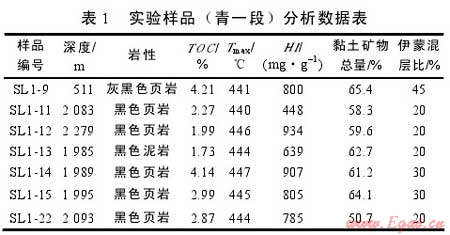 實驗樣品取自松遼盆地北部齊家古龍凹陷、三肇凹陷白堊系青山口組一段泥頁巖(見圖1)。實驗樣品有機質(zhì)豐度較高(見表1),有機碳含量平均2.89%;有機質(zhì)類型以Ⅰ、Ⅱ1型為主,氫指數(shù)一般在639~934mg/g;樣品主要處于中成巖作用階段,伊蒙混層比平均26.4%。全巖分析實驗表明,樣品中黏土礦物含量較高,為50.7%~65.4%,平均60.3%,其次為石英(17.5%~25.0%)、斜長石(7%~12%)、黃鐵礦(3%~6%)、方解石(1%~5%),此外還有少量的鉀長石、白云石和菱鐵礦,不含赤鐵礦和方沸石(見圖2)。