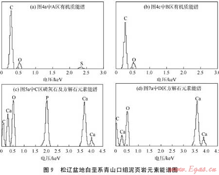 溶蝕孔隙主要是泥頁巖中方解石、磷灰石等碳酸鹽、磷酸鹽或硅鋁酸鹽在溶蝕作用下(主要是由于頁巖生烴過程中生成的有機酸或CO2溶于水形成碳酸,產(chǎn)生溶解作用)產(chǎn)生的孔隙。圖5為場發(fā)射電鏡和掃描電鏡下觀察到的礦物溶蝕孔隙。由圖5a可見磷灰石、方解石溶蝕后產(chǎn)生的大量溶蝕孔隙。圖5a中黃線標出的黑灰色區(qū)域C區(qū)對應的元素能譜見圖9c,區(qū)域內(nèi)鈣、氧、磷、碳元素含量較高,據(jù)此判斷溶蝕孔隙是磷灰石、方解石礦物溶蝕后產(chǎn)生,孔徑為10~500nm。由圖5b可見充填于溶蝕孔隙中的柱狀石膏和粒狀黃鐵礦,孔徑為100~2500nm。