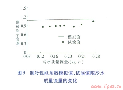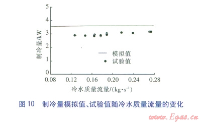 其他參數不變,制冷性能系數、制冷量模擬值、試驗值隨冷水質量流量的變化分別見圖9、10。由圖9、10可知,制冷性能系數、制冷量的模擬值均隨冷水質量流量的增大而增加,但上升的趨勢相當平緩,且試驗值低于模擬值。