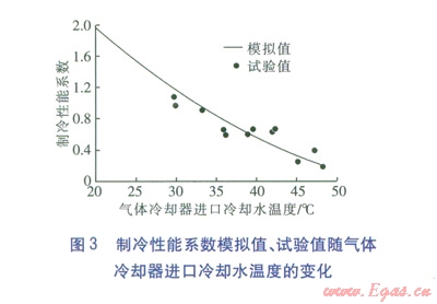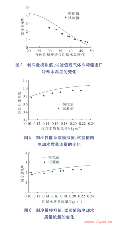 其他參數不變,制冷性能系數、制冷量模擬值、試驗值隨氣體冷卻器進口冷卻水溫度的變化分別見圖3、4。由圖3、4可知,隨著氣體冷卻器進口冷卻水溫度的升高,制冷性能系數、制冷量模擬值、試驗值均呈下降趨勢。這說明降低氣體冷卻器進口冷卻水溫度,對提高制冷量是有利的。