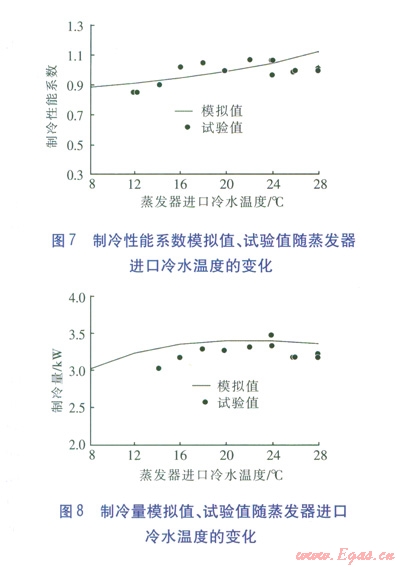 其他參數不變,制冷性能系數、制冷量模擬值、試驗值隨蒸發(fā)器進口冷水溫度的變化分別見圖78。由圖7可知,制冷性能系數模擬值隨蒸發(fā)器進口冷水溫度的增大而增長,但增長的幅度比較平緩。制冷性能系數試驗值先隨蒸發(fā)器進口冷水溫度的增大而提高,然后出現下降的趨勢,但整體呈上升趨勢。由圖8可知,制冷量的模擬值、試驗值隨蒸發(fā)器進口冷水溫度的增大先稍稍增大,然后趨于平緩,只是在蒸發(fā)器進口冷水溫度較高時出現了略微下降,模擬值與試驗值的變化趨勢比較一致。