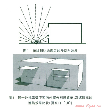 室內(nèi)的采光和視野。同一外挑系數(shù)下南向外窗分別設(shè)置單、雙遮陽(yáng)板的遮擋效果比較(夏至日10:O0)見(jiàn)圖2。由圖2可知,設(shè)置雙遮陽(yáng)板也能加強(qiáng)對(duì)直射光的遮擋。當(dāng)直射光從非正南入射時(shí),第二遮陽(yáng)板能夠有效地削弱進(jìn)入室內(nèi)的太陽(yáng)直射光,并且能將投射到下遮陽(yáng)板的直射光以漫反射的形式投射到室內(nèi)深處,加強(qiáng)室內(nèi)深處的采光效果。