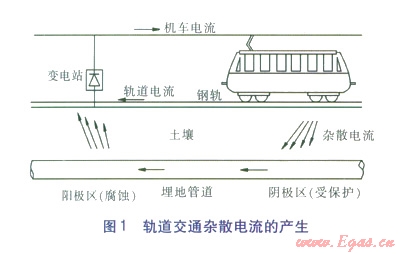 城市軌道交通一般包括城市地鐵、輕軌列車、有軌電車等,多采用直流l 500/750 V驅(qū)動,走行軌回流,系統(tǒng)供電回路與雜散電流的產(chǎn)生見圖l。變電站將交流電變換為直流電,經(jīng)接觸網(wǎng)向機車供電,電流由鋼軌及與之相連的導(dǎo)線返回變電站。由于鋼軌具有一定的電阻,電流在鋼軌中產(chǎn)生電位差,同時鋼軌對地也存在電位差,軌道不可能完全對地絕緣,使得鋼軌中部分電流泄漏進入大地形成雜散電流。泄漏到大地的雜散電流流入地下構(gòu)筑物、埋地燃氣管道等埋地金屬結(jié)構(gòu),經(jīng)埋地金屬結(jié)構(gòu)流至變電站負極附近通過土壤重新流入鋼軌,在電流流出的部位金屬發(fā)生腐蝕[5]。