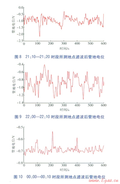 由各時段管地電位變化可得,軌道交通運行期間管地電位存在很大波動,圖2為軌道交通正常運行期間機車通過測試點時管地電位變化,電位波動有明顯峰值,極大值與極小值分別為0 V、-2.5 V; 圖4為單列運行期間無機車通過測試點時管地電位變化,由于其他位置通過機車電流的影響,管地電位仍有明顯波動,但幅值較機車通過時刻有所減?。粓D6中軌道交通停運后,管地電位波動明顯減小,但高頻采集數(shù)據(jù)中存在干擾信號,數(shù)據(jù)頻繁對稱波動,需要進行濾波處理。所測結(jié)果表明所測地段燃氣管道受到雜散電流干擾,且雜散電流的產(chǎn)生與軌道交通運行有直接關(guān)系。