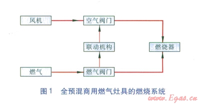 全預(yù)混商用燃?xì)庠罹叩娜紵到y(tǒng)主要包括:全預(yù)混燃燒器、燃?xì)忾y門、空氣閥門、風(fēng)機(jī)、管道、聯(lián)動機(jī)構(gòu)等,見圖l。其中聯(lián)動機(jī)構(gòu)是以燃?xì)忾y門的開度為信號,對空氣閥門進(jìn)行開度控制,有機(jī)械傳動與電子傳動兩種方式。
