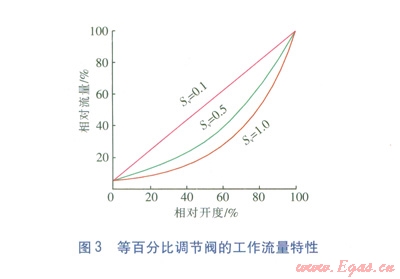 實際使用時,調(diào)節(jié)閥安裝在具有一定阻力的管道上。閥門開度變化在改變流量的同時也改變管道的阻力,因此在同一開度下,通過調(diào)節(jié)閥的實際相對流量與理想流量有一定偏差。通過調(diào)節(jié)閥的實際流量與相對開度的特定關(guān)系稱為閥門的工作流量特性,關(guān)系式見式(2)。等百分比調(diào)節(jié)閥的工作流量特性見圖3。