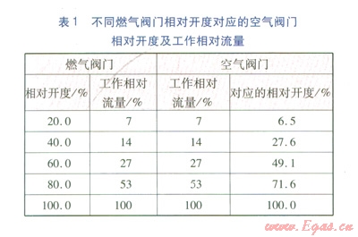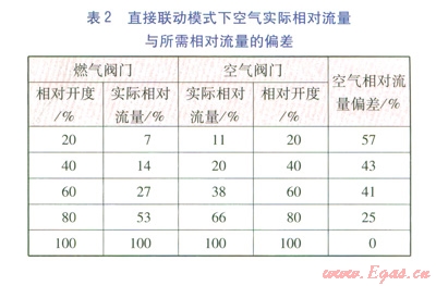 由以上關(guān)系式,還可得到燃?xì)忾y門與空氣閥門直接聯(lián)動,空氣的實際相對流量與所需相對流量的偏差,見表2