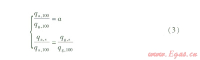 欲使全預(yù)混商用燃?xì)庠罹叩膶嶋H空燃比值等于設(shè)計空燃比值。,選用的閥門應(yīng)該滿足兩個條件:第一,兩閥門都在最大開度下,實際空氣流量qa,l00等于實際燃?xì)饬髁?/font>qg,l00a倍;第二,燃?xì)忾y門相對開度減小后,調(diào)節(jié)空氣閥門的相對開度,能夠保證空氣閥門的相對流量值等于燃?xì)忾y門的相對流量值。即: