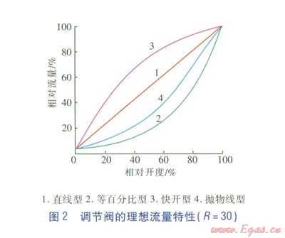 常見的調(diào)節(jié)閥理想流量特性有直線流量特性、等百分比流量特性、快開流量特性和拋物線流量特性4種類型,見圖2。