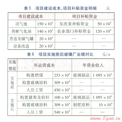 根據(jù)項(xiàng)目改造需要,在玻璃廠原有生產(chǎn)設(shè)備基礎(chǔ)上,需要修建沼氣池、熱解氣化站、儲(chǔ)氣罐等設(shè)施,應(yīng)列入建設(shè)成本。由于該項(xiàng)目符合國(guó)家政策中著力進(jìn)行綠色能源縣以及新農(nóng)村建設(shè)的思路,可得到發(fā)改委以及農(nóng)業(yè)部門的財(cái)政補(bǔ)貼。結(jié)合企業(yè)自籌資金,項(xiàng)目改造具有充分的經(jīng)濟(jì)保證。項(xiàng)目建設(shè)成本、項(xiàng)目補(bǔ)貼資金明細(xì)見(jiàn)表5,項(xiàng)目實(shí)施前后玻璃廠業(yè)績(jī)對(duì)比見(jiàn)表6。項(xiàng)目實(shí)施前的人員數(shù)量為100人,實(shí)施后新增崗位30個(gè)。
