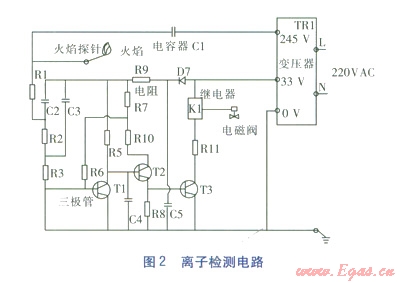 離子檢測是利用火焰燃燒時產(chǎn)生的外層離子導(dǎo)電原理,外層離子導(dǎo)通電子電路的放大元器件,從而判定火焰狀態(tài)。利用離子檢測的電路很多,現(xiàn)介紹以下電路作為參考,見圖2。