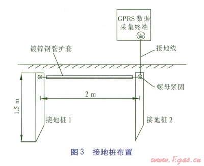 接地是通過金屬導(dǎo)線與接地裝置連接。需要接地的點(diǎn)有流量計(jì)表頭、數(shù)據(jù)采集終端機(jī)箱和金屬護(hù)套管。與建筑物共用防雷接地體的接地電阻應(yīng)小于1Ω,單獨(dú)打接地樁的接地電阻應(yīng)小于4Ω。與接地體連接的接地線應(yīng)使用l根截面積為6 mm2以上的BVR單芯軟銅線或編織銅線。單根接地樁接地電阻達(dá)不到4Ω的,應(yīng)再增加接地樁數(shù)量,直至滿足接地電阻要求。相鄰兩根接地樁之間的距離不應(yīng)小于2 m。接地樁布置見圖3。