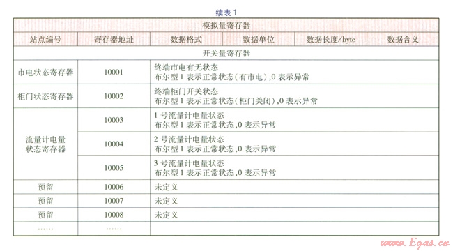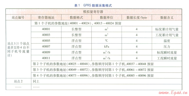 完整的遠(yuǎn)傳抄表數(shù)據(jù)包內(nèi)有兩種類型的數(shù)據(jù),一種是模擬量數(shù)據(jù),如流量、壓力、溫度等,通過內(nèi)部控制模塊轉(zhuǎn)換成數(shù)字量數(shù)據(jù);另一種是狀態(tài)信號數(shù)據(jù),如市電狀態(tài)、采集終端柜門狀態(tài)等開關(guān)量數(shù)據(jù)。GPRS數(shù)據(jù)采集格式見表l。