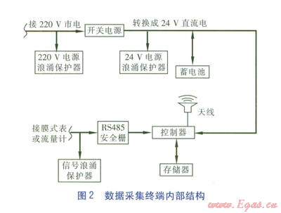 數(shù)據(jù)采集終端(DTU)是遠(yuǎn)傳抄表系統(tǒng)的重要設(shè)備之一,具有RS485232接口,通信速率為300115 200 bits,通信協(xié)議采用MODBUS RTUASC Ⅱ工業(yè)通信協(xié)議,內(nèi)部供電為24 V直流電。l個(gè)數(shù)據(jù)采集終端一般接13只燃?xì)獗?。?shù)據(jù)采集終端內(nèi)部結(jié)構(gòu)見圖2。