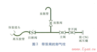 考慮到卸氣柱是高壓管道系統(tǒng),其主閥在使用過程中發(fā)生內(nèi)漏時,就要及時更換。由于一般都是2套或3套卸氣柱通過高壓管道匯合在一起后連接到CNG減壓橇的進(jìn)口,如果某一卸氣柱的主閥需要更換時,就要停止所有卸氣柱工作并放空高壓管道中的CNG。如果不允許CNG減壓橇停氣,就無法更換閥門。要解決這一問題,可以在卸氣柱主閥后面增加一個常開閥(此時主閥成雙閥結(jié)構(gòu))。帶雙閥的卸氣柱見圖3。